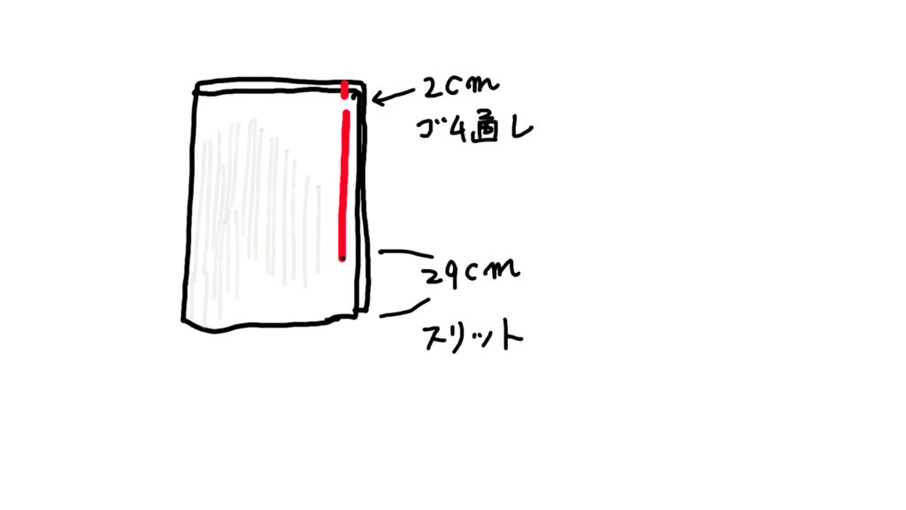 ①生地を中表に半分折りにし、耳をスリットの手前まで縫う。その時にゴム通しの穴も開けておく。
